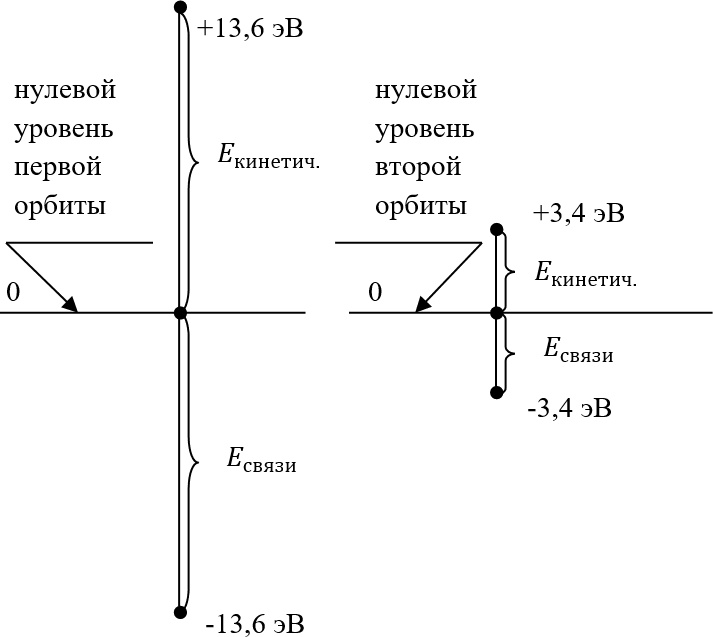 Если же за нулевой уровень энергии для каждой данной стационарной орбиты принимать тот уровень энергии системы, вокруг которого происходят колебания энергии системы, то ту часть потенциальной энергии, которая расходуется в системе на удержание электрона на стационарном уровне, можно будет считать «энергией связи» электрона к уровню данной орбиты. И тогда кинетическая энергия движения электрона по орбите (как её положительное отклонение от энергии нулевого уровня орбиты) и энергия связи к уровню орбиты (как её отрицательное отклонение от энергии нулевого уровня) будут являться теми дисперсиями, колеблющими энергию вокруг математического ожидания как среднего уровня энергии орбиты уровня, приравненного к нулевому (рис. 21.6).