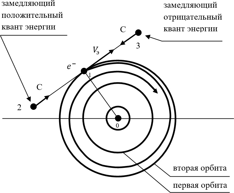 Рассмотрим теперь случай перевода электрона со второй орбиты на первую действием на электрон замедляющих квантов энергии. Здесь квант, налетающий из точки 2 (рис. 21.7) должен быть тормозящим положительным; квант из точки 3 замедляющим отрицательным, отталкивающим электрон в сторону противоположную источнику этого отрицательного кванта.