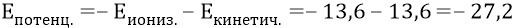 Кинетическая энергия электрона первой орбиты является базовой величиной и равна «плюс 13,6 эВ». Следовательно, потенциальной энергией электрона на орбите (энергией атома) была следующая: