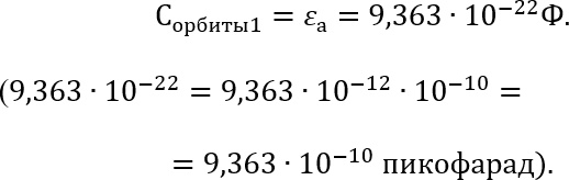 Электроёмкость в электростатике характеризует способность проводника (у нас дуги окружности) накапливать заряд. Если бы на «проводник»-орбиту можно было бы поместить заряд 1 Кл, и этот заряд на дуге-окружности орбиты создал бы потенциал 1 В, то электроёмкость проводника («конденсатора»-орбиты) была бы равна 1 Ф (один фарад):