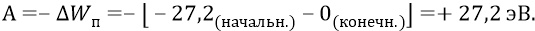 При этом над орбитальным электроном была совершена работа А («работа выхода»). Можно считать, что тот потенциал поля, под которым на этой орбите находился электрон, превратился теперь для свободного электрона в почти нулевой потенциал как в потенциал заряда, очень далеко удалённого (через много-много орбит) от заряда ядра. Но полная энергия электрона (атома) на орбите имела величину: