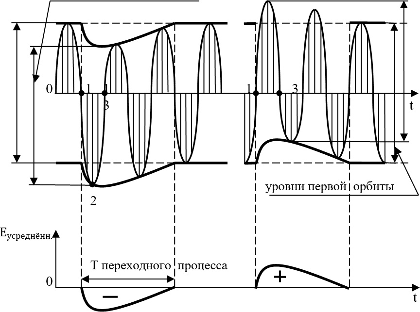 Фактически на нижних диаграммах рисунка 21.9 представлена структура фотона, излучаемого атомом во время всего переходного (излучательного) процесса. В качестве огибающей этого сигнала мы выбираем закон изменения усреднённой напряжённости суммарного поля, излучаемого атомом (электроном и протоном). Если