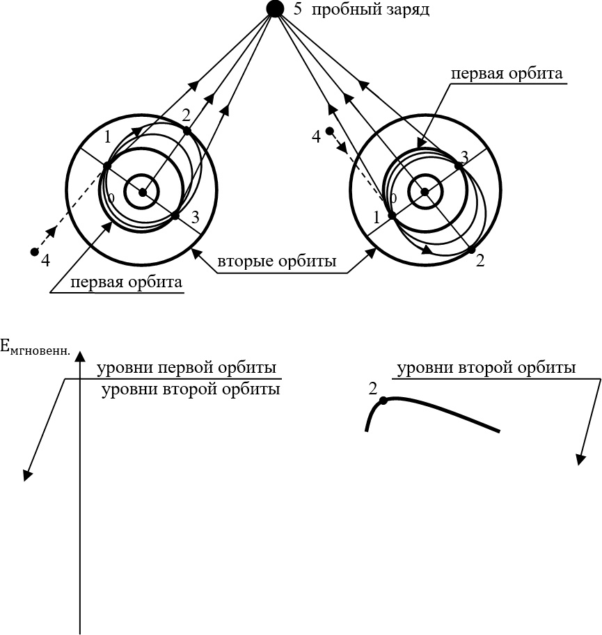 Ещё раз, но уже более понятно для школьника, то есть без обращения к фурье-преобразованиям. Глядя на нижнюю диаграмму рисунка 21.9, мы видим то, как атом, быстро возбудившись, затем «медленно» успокаивается. При этом электрон движется по эллипсо-подобной орбите, медленно приближаясь «круг за кругом» к первой круговой атомной орбите. В переходном процессе левого атома электрон большую часть времени смещён в сторону пробного заряда точки 5, то есть атом суммой двух «зарядов» (электрона и протона) излучает всегда усреднённую отрицательную амплитуду поля E. В правом атоме электрон в среднем смещён дальше от точки 5, чем «стоящий на месте» положительный протон. Поэтому здесь атом излучает усреднённое положительное поле для точки 5. То есть в среднем за весь переходный процесс левый атом будет излучать в точку 5 только сплошь отрицательные кванты энергии, а правый атом только положительные кванты энергии. Но спектроскописты никогда не видят излучение отдельного атома. Они воспринимают процесс излучения сразу многих атомов. А эти возбуждения большого количества атомов всегда подчинены закону больших чисел. Который говорит о том, что, например, в газе число «положительных» атомов, излучающих в данное мгновение положительный квант энергии в точку наблюдения за газом, с большой степенью точности равно числу «отрицательных» атомов, излучающих в эту же точку в это же мгновение «отрицательные» кванты энергии.