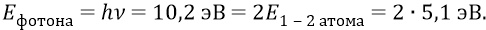 То есть мы не изменяем фундаментальную порцию энергии 10,2 эВ, соответствующую измеренной длине волны 121,57 нм, но мы её, как целую, только относим к двум разным атомам, которые в одно и то же время излучают каждый: отрицательную порцию энергии эВ (первый атом) и положительную порцию энергии