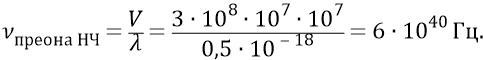 Тогда собственная частота этих преонных квантов, которые составляют электромагнитно образующее поле ядра электромагнитной частицы, составит величину (притом, что принимаем превышение скорости гравитации над скоростью света на 7 порядков величины, а превышение скорости преонов над скоростью гравитации ещё на 7 порядков):