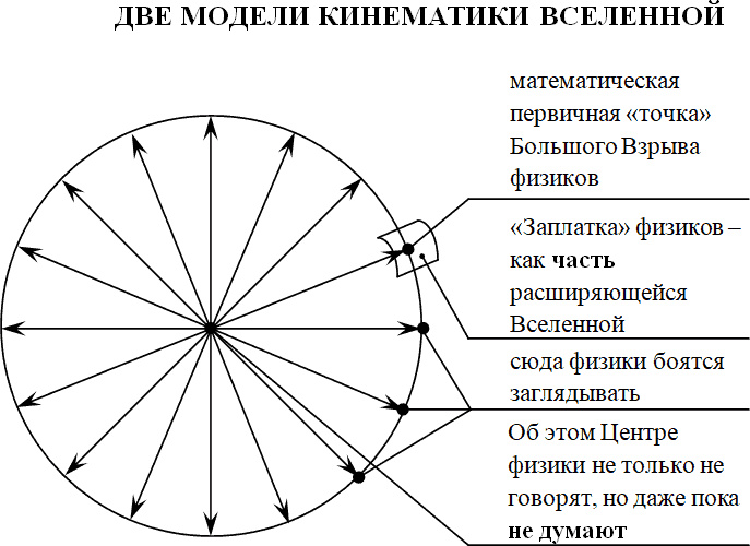 К чему же главному в своей недосказанности приводит очередная детская ошибка физиков? Она приводит к невращающейся точке, стоящей на месте. И отсюда начинается Большой Взрыв. И только уже поэтому этот Взрыв им видится тем, когда рождающаяся в нём «масса» разлетается-отлетает от точки во все стороны пространства точно по лучам, исходящим из единой точки. Но в реальной Природе такого события никогда не может быть. Сейчас мы покажем школьнику принципиальную разницу двух подходов к одному и тому же Взрыву (рис. 20.2).