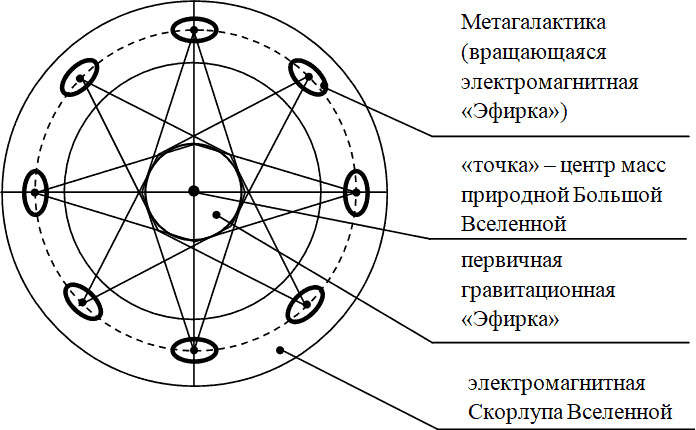 Это означает, что эти их «Метагалактики» они размещают не внутри Полной Вселенной (куда они заглядывать боятся), но внутри той же Заплатки. А это, в свою очередь, означает, что в качестве этих их «Метагалактик» они обязаны представлять не всю видимую физиками область, которую те и называют Вселенной (видимой Вселенной), но лишь скопления галактик, хоть и «гигантские скопления». Но эти «скопления Метагалактики» находятся у них на периферии одной Заплатки внутри неё. Это другое представление о Метагалактике. Не такое, как у нас. У нас Метагалактика это, грубо говоря, каждая «видимая Вселенная» физиков, то есть это то множество подобных, куда физики боятся заглядывать. Но мы туда уже заглянули. То есть мы сделали, по отношению к физикам, следующий шаг в представлении о Вселенной. Даже по отношению к единичной «вселенной».