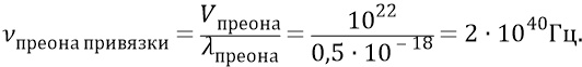 При этом частота тех преонов, которые мы называем «преонами привязки» и которые держат орбитальные преоны на нитках их электромагнитных орбит в частице, определяется длиной волны такого преона, делающего на диаметре частицы полный оборот вокруг своей оси: