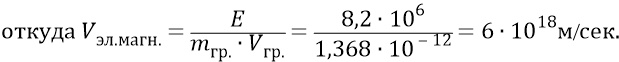 Мы видим, что полученная скорость в 2000 раз превышает гравитационную скорость . Но здравый смысл состоит в том, что электромагнитная частица не может получить скорость, большую скорости первичной частицы. Это следует из того, что нитка электромагнитной орбиты новой частицы накручивается на гравитационное ядро ровно поперёк скорости движения первичной. Поперечные моменты количеств движения не могут привести к возрастанию имеющейся скорости. Поэтому мы можем принять скорость электромагнитной частицы максимально возможной, но соответствующей здравому смыслу. Такой скоростью будет принятая нами скорость гравитации