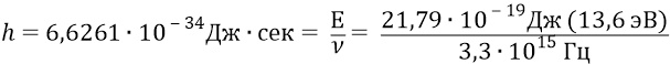 Итак, если наш квант энергии летит со скоростью света, колеблется с частотой ν=3,3 Гц (количество его колебаний в секунду) и имеет энергию Е=13,6 эВ, то он по самой философии слова «действие» как бы совершает действие в течение секунды, равное планковскому кванту действия: