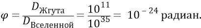 его длина настолько непостижимо огромна для нас, что он словно бы выпрямлен в отношении своей гигантской длины настолько, что эта его кривизна составляет угол Но в этом Жгутике с такой его кривизной, находится объёмный эфир, то есть как бы находится то пространство, которое теперь, через сотни миллиардов лет после расширения, через Эры инфляции и замедления, стало «прямым».