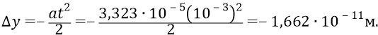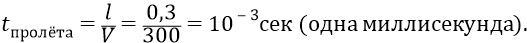 Если же мы задумаем вращать эту установку двигателем, с частотой вращения, скажем, 10 оборотов в секунду, то все наши параметры (как «электронные», так и механические) «поплывут» в худшую сторону для электронных точностных характеристик, но в лучшую сторону для механических точностных. Сразу же скажем о том, что при частоте вращения установки 10 Гц трубу придётся «обкорнать» на порядок её длины до 30-ти сантиметров активного участка «пушка-экран». Вся труба-цилиндр здесь будет иметь длину 0,5 м. Причём по 10 см с обоих концов займёт электронная аппаратура ускорителя и экрана (останется активная зона отклонения электронного луча 30 см). Тогда, двигаясь со скоростью 300 м/сек, «измерительный» электрон преодолеет активный путь за время: