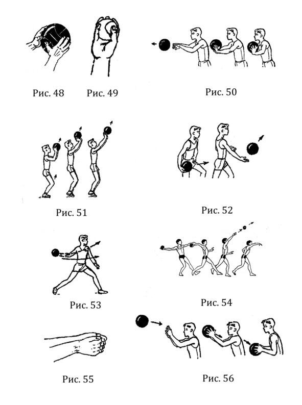 Подбивание большого мяча двумя руками снизу. Чаще всего применяется в волейболе при приеме и перепасовке мяча. Кисти соединены одна к другой кулаками или наложив согнутые пальцы одной на кулак другой, большие пальцы сверху выпрямлены, составляя как бы одну плоскость с предплечьями (рис. 55). Летящий мяч подбивается прямыми руками в области нижней части предплечий или лучезапястных суставов. Перед приемом мяча следует подсесть и выполнить удар в основном за счет разгибания ног с ограниченной амплитудой движения рук (рис. 57). Такой удар будет точнее.