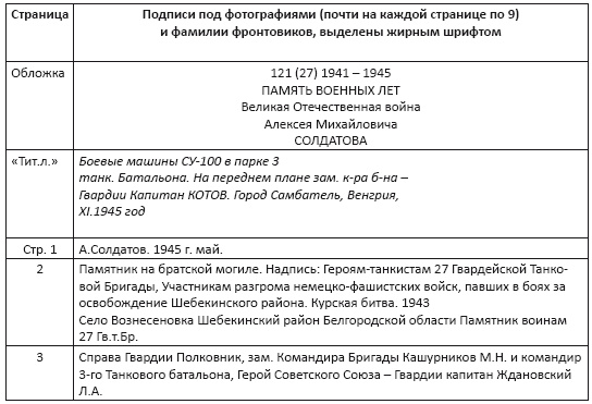Отец Нины, Алексей Михайлович СОЛДАТОВ (о нём глава в первом томе альманаха), был танкистом. Почерку него был каллиграфический, его назначили писарем. Видимо, это и сыграло свою роль: во имя с охранения образов однополчан в людской памяти, стал собирать фотографии. Жаль, что не успел восстановить все фамилии 270 фотокарточек фронтовиков! Они дышат историей, свидетели тех памятных событий Они могут рассказать нам о многом и многих солдатах Великой Отечественной войны. Вглядитесь пристальнее в их лица! Возможно, вы узнаете своих родных? Назовёте их имена и фамилии?