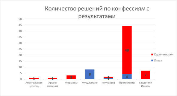 Из 33 рассмотренных решений в первой инстанции лишь 6 приняты в пользу религиозной организации, в апелляционной инстанции количество дел, рассмотренных в пользу религиозной организации составляет лишь 4 из 29.