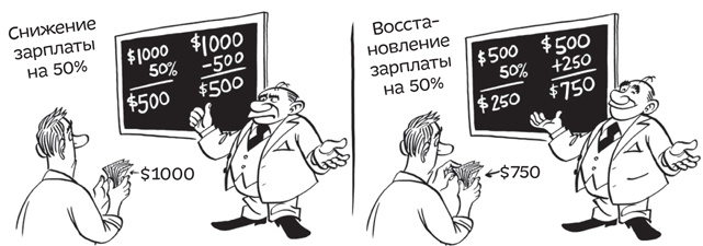 Писатель Дэн Кеппел даже назвал свою книгу Get What You Pay For: Save 200 % on Stocks, Mutual Funds, Every Financial Need («Получите то, за что вы платите: экономьте 200 % на бирже, инвестиционных фондах открытого типа, на любой финансовой потребности»). У Кеппела есть степень MBA. Ему следует лучше разбираться в вопросе. Конечно, чтобы аккуратно сравнивать проценты, их нужно брать от одного и того же базового показателя. Нельзя вернуться к изначальному уровню зарплаты, сокращенной на 50 %, увеличив на 50 % вашу новую, более низкую зарплату[11].