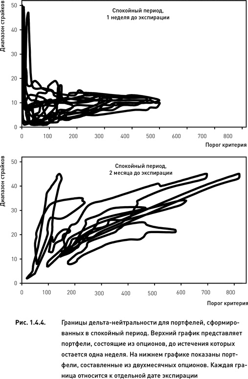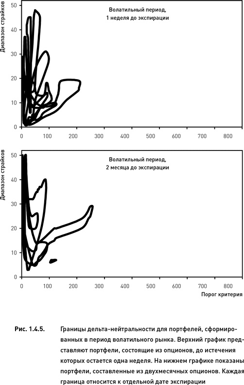 В период экстремальных колебаний рынка границы дельта-нейтральности в целом напоминают по форме границы периода спокойного рынка. Однако они простираются не настолько далеко вдоль оси порога критерия (сравни рис. 1.4.4 и 1.4.5). Это означает, что во время волатильного рынка построение дельта-нейтральных портфелей с использованием только таких опционных комбинаций, которые обладают исключительно высокими показателями критерия, невозможно.