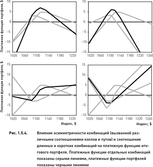 При объединении однотипных комбинаций с одинаковым соотношением коллов и путов результирующая платежная функция будет напоминать по форме функции исходных комбинаций. На верхнем левом графике рис. 1.5.4 серыми линиями показаны платежные функции двух коротких стрэнглов с соотношением колов и путов 1: 3. Такое соотношение приводит к тому, что левое плечо обеих функций имеет гораздо больший угол наклона по сравнению с правым плечом (это означает, что снижение индекса приводит к большим убыткам, чем его рост). Так же выглядит и платежная функция портфеля (черная линия), состоящего из этих двух комбинаций.
