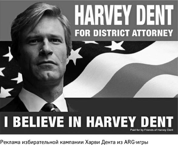 Действие фильма «Темный рыцарь» начинается после вступления в должность нового окружного прокурора, и его выборы становятся одним из главных элементов вирусной рекламной кампании картины. С процедурой народного волеизъявления связано более десяти сайтов, объединенных пространством единой виртуальной игры «Ты почему такой серьезный?». Создатели вирусного контента постоянно связывали персонаж Бэтмена с событиями, предшествовавшими голосованию. Тема ночного мстителя была главной в дебатах между кандидатами на должность окружного прокурора. В первом из обнародованных выпусков передачи «Gotham tonight» канала СGN (Cable Gotham News), позже включенном в бонусы DVD-издания, рассказывается, как Бэтмен обезоружил на избирательном участке трех бандитов противников Дента, которые пытались помешать процессу голосования. На первой полосе виртуальной газеты Gotham Times{41} все четыре материала затрагивают выборы и победу Харви Дента, в том числе передовица «Бэтмен: Спасение или угроза?». Одним из заданий в виртуальной игре стало выйти на улицу с транспарантами в поддержку Дента, и люди собирались группами в десятках городов США. Активность веб-страниц, связанных с выборами, начиналась в марте и закончилась в июне 2008 г. В финале виртуальной игры Джокер 10 июля взломал все предвыборные сайты и расписал их своими ругательствами, испортив контент.