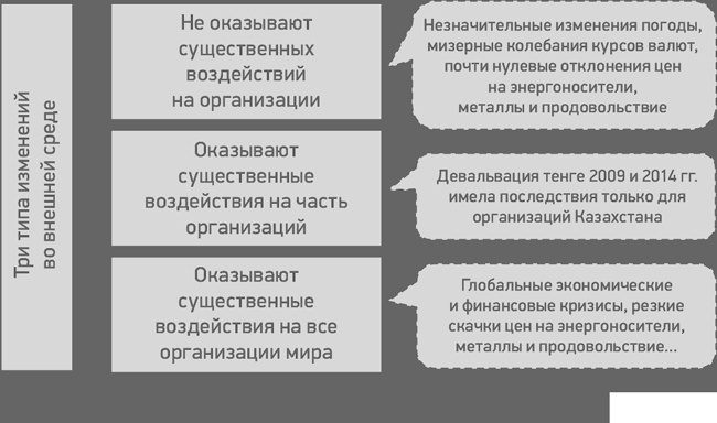 Одни и те же изменения по-разному сказываются на судьбе организаций. Для одних организаций это воздействие может быть позитивным, для других негативным. Девальвация казахстанского тенге в 2009 и 2014 годах оказала существенное воздействие на местные (локальные) организации, а также на организации приграничных областей соседних государств. Для казахстанских экспортеров эти воздействия были позитивными, тогда как для импортеров наоборот, негативными.