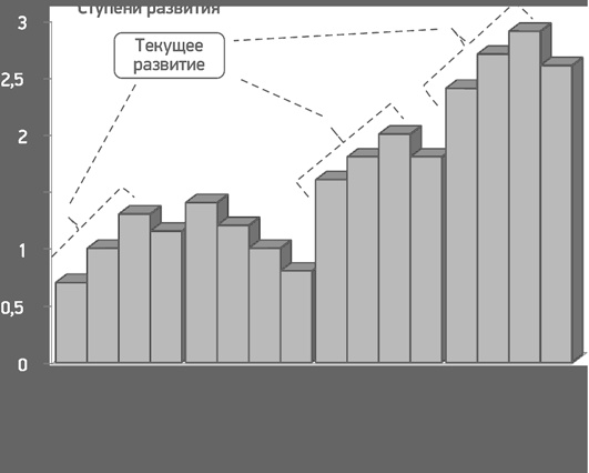Итак, развитие организации происходит поступательно от ступени к ступени посредством чередования текущего и стратегического развития.