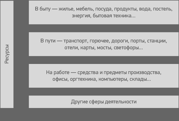 Любая деятельность человека требует наличия соответствующих ресурсов. В быту нам необходимы жилье, мебель, продукты питания, посуда, постель, бытовая техника, энергия, средства связи и т. д. В пути автомобиль, горючее, мобильная связь, дороги, мосты, светофоры, парковки На работе мы используем средства и предметы производства, офисы и торговые площади, склады, энергоресурсы и многое другое (рис. 14).