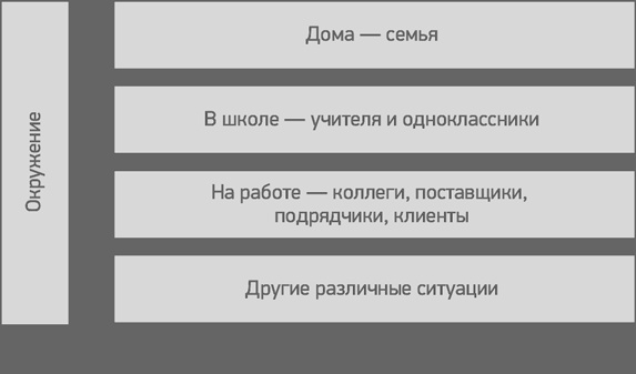 Разные виды деятельности предполагают различное окружение, в рамках которого происходит наше взаимодействие с другими людьми. Дома это, конечно, семья. В школе или университете преподаватели и товарищи по учебе. На работе руководители, коллеги, поставщики, подрядчики и клиенты. В общественном транспорте, в кафе, на стадионе или в библиотеке везде нас окружают люди. Практически все наши действия предполагают наличие окружения (рис. 13).