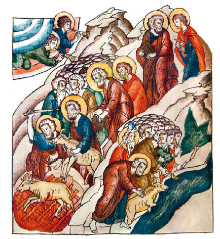 Осторожно спускался Моисей с горы, бережно нес скрижали Завета. А навстречу ему неслись звуки песен и плясок опьяневших от вина израильтян. Когда Моисей увидел золотого тельца и пьяные веселые лица, сердце его вспыхнуло гневом, он бросил под горой скрижали Завета, и они раскололись на мелкие кусочки. Моисей схватил золотого тельца, сжег его, собрал пепел, растворил его в воде и заставил каждого пить воду с золотой пылью. И вытесал Моисей две скрижали каменные, подобные прежним, и, встав рано поутру, снова взошел с ними на гору Синай, как повелел ему Господь.