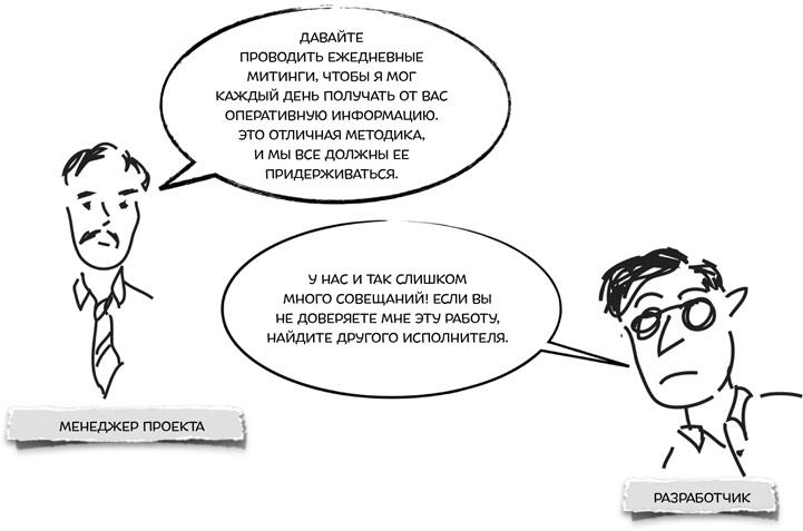 Рис. 1.1. Менеджер проекта, желающий, чтобы команда проводила ежедневные митинги, удивлен, что это нравится не всем