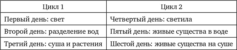 Повествование о шести днях творения (Быт 12) традиционно называется «Шестоднев». Нетрудно заметить, что созидательная деятельность Бога как бы делится на два цикла, обладающих сходной последовательностью.