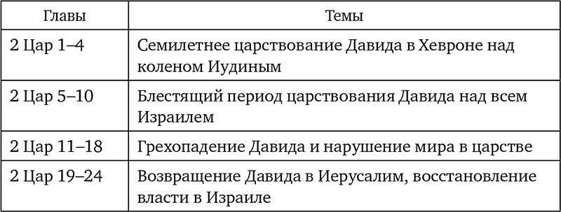 Вторая книга Царств целиком посвящена времени правления Давида[356]. Вторую книгу Царств, насчитывающую 24 главы, можно разделить на четыре части.