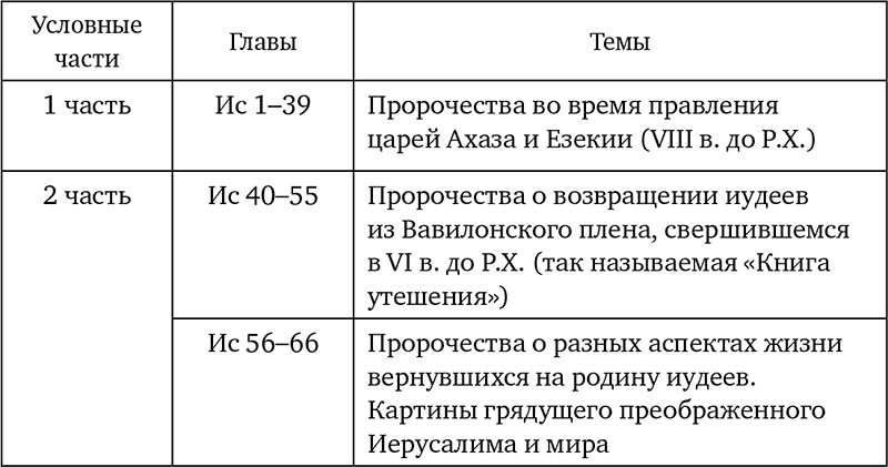 Книга пророка Исайи состоит из 66 глав, в ней выделяются две основные части, границей которых является 40-я глава. Вторая часть говорит о событиях после Вавилонского плена. Современные библеисты считают, что вторая половина книги была написана последователями пророка, продолжавшими его традицию[489]. В нижеследующей таблице представлено более детальное деление книги.