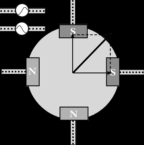 Тесла заметил неэффективность таких машин и изобрел двигатель, основанный на другом принципе. В нем используется сразу две пары проводов с переменным током, который меняет свое направление туда-обратно. Причем колебания тока не синхронизированы. Это называется двухфазный переменный ток. При подключении тока к электромагнитам возникает два магнитных поля, полярность и направление которых постоянно меняется. Но, складываясь, они образуют единое вращающееся магнитное поле. Теперь достаточно поместить в него любой металлический предмет: в нем будут наводиться индукционные токи, и он будет послушно поворачиваться вслед за полем! Эта задумка позволила создать простой и эффективный двигатель переменного тока без искрения и прочих недостатков.