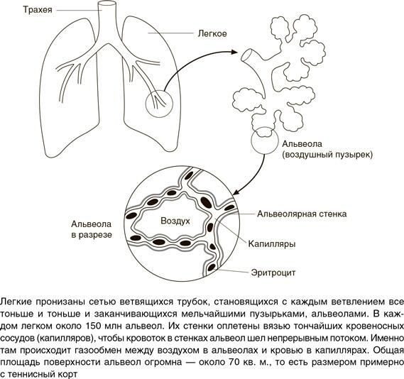 Отек легких, когда легкие переполняются жидкостью, возникает вследствие реакции кровеносных сосудов легких на снижение уровня кислорода на больших высотах. На уровне моря низкое содержание кислорода в отдельном легочном пузырьке (альвеоле) обычно означает, что приток воздуха затруднен. Ввиду невозможности провести кровь через эту альвеолу прилегающий кровеносный сосуд сжимается, перекрывая кровоток и перенаправляя его в другую, лучше вентилируемую область. К сожалению, сосуды не различают снижение уровня кислорода в альвеолах из-за блокирования дыхательных путей и спада парциального давления кислорода во вдыхаемом воздухе. Поэтому на большой высоте они сокращаются в любом случае. Однако одни сосуды более чувствительны к перепадам уровня кислорода, чем другие, поэтому сосудистый спазм происходит неравномерно. В результате усиливается кровоток в свободных капиллярах, приводя к повышению кровяного давления в легких. Из капилляров выделяется жидкость, которая затем скапливается в альвеолах или между ними. Примерно то же самое происходит, когда отверстия в душевой лейке забиваются известковым налетом напор воды в свободных отверстиях неизменно возрастает. Поскольку через гиперчувствительные (а значит, сократившиеся) капилляры жидкость не проходит, отек происходит неравномерно как точно подметил один эксперт, «отекшее легкое похоже на мешок с пушечными ядрами».