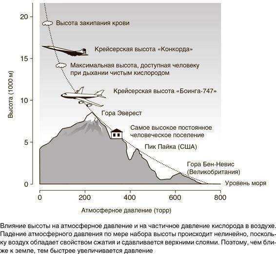 Присутствие пара в альвеолах объясняет, почему парциальное давление кислорода в этих воздушных пузырьках ниже, чем в атмосфере (кроме того, кислород постоянно расходуется на нужды организма). Этим же фактором определяется физический предел высоты, которой может достичь человек, даже дыша чистым кислородом. Нижняя граница барометрического давления, при котором поддерживается нормальная концентрация кислорода в легких (100 торр), при дыхании чистым кислородом соответствует примерно 10 400 м, что равно высоте полета большинства пассажирских лайнеров. На большей высоте выжить тоже можно, поскольку при учащенном дыхании выпускается больше углекислого газа и освобождается место под кислород. Однако уже на высоте 12 20013 700 м кислорода вырабатывается недостаточно, и человек теряет сознание. Выше 18 900 м при температуре тела кровь «закипает», т. е. фактически испаряется. Тем самым объясняется, почему для подобных высот и космических путешествий необходим герметичный скафандр или капсула с автономной системой подачи воздуха (см. гл. 6).