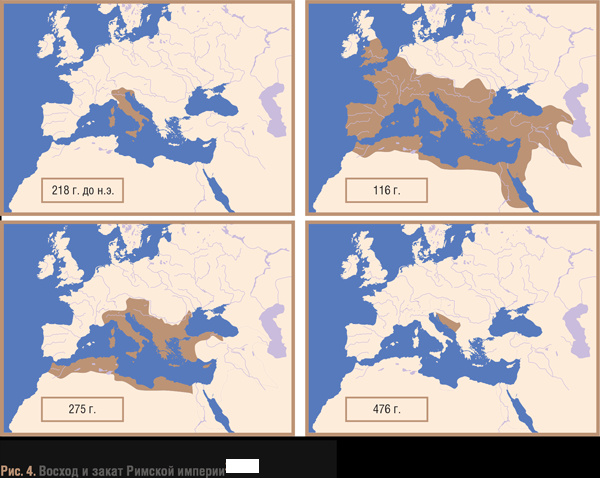 Если взглянуть на карту Римской империи (ее территория обозначена красным цветом) в разные периоды ее существования начиная с 218 г. до н. э. (рис. 4[67]), то нетрудно заметить, что наивысшая точка развития была пройдена в 116 г. Затем наступил спад разделение ранее единой империи на две части и захват варварами бывшей столицы. Некогда великий город был разграблен, наполовину разрушен в результате бесконечных варварских и папских войн[68]. Счастливый клевер зачах.