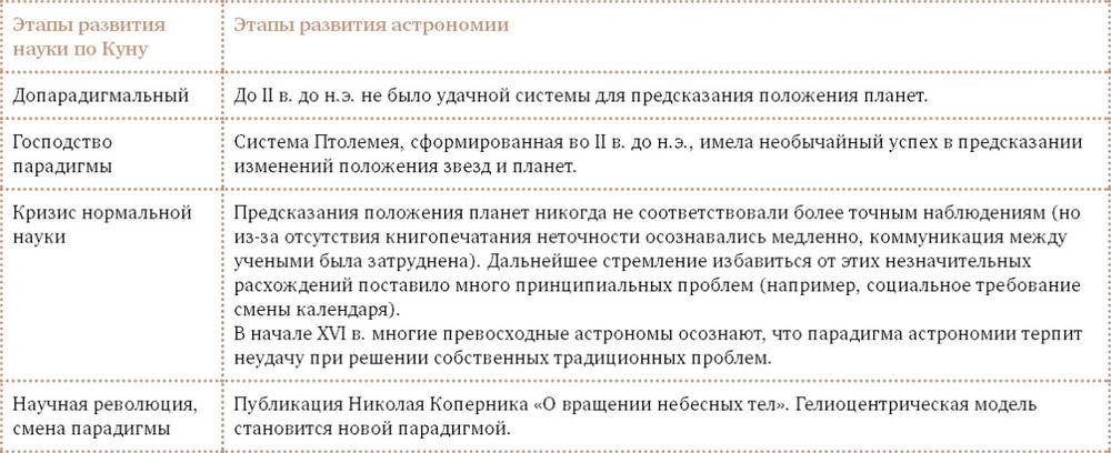 Первый закон Ньютона, или закон инерции, во многом повторяет принцип физики Аристотеля о бесконечности движения в свободном пространстве. Новые научные методы заложили ход истории в каждой области науки для последующих поколений ученых. Это было возможно в силу достаточной открытости научных трудов, позволявшей новым поколениям ученых находить для себя нерешенные проблемы любого вида. Кун выделял несколько этапов в развитии научной дисциплины: допарадигмальный этап (предшествующий установлению парадигмы), этап господства парадигмы (нормальная наука), кризис нормальной науки и этап научной революции, суть которого заключена в переходе от одной парадигмы к другой (Кун, 1977, с. 11). Этот принцип очень сильно напоминает этапы, которые рисовали позже последователи Шумпетера, описывая теорию «смены технологических парадигм». Те же S-образные кривые, восходящие с течением времени. Проиллюстрируем сказанное на примере из книги Т. Куна «Структура научных революций» (табл. 2).