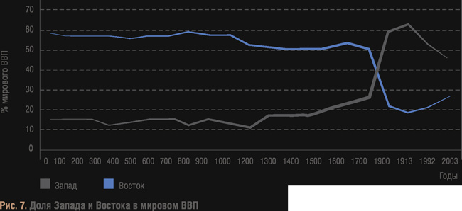 В конце предыдущей главы я говорил о хорошо заметной на статистических рядах смене долгосрочной перспективы экономических показателей в Западной Европе (Delong, 1988). В 1000 г. уровень доходов в Европе был ниже, чем в Азии и Северной Африке. Однако начавшийся длительный период «восстановления» позволил догнать Китай (мирового лидера того времени) уже в XIV в. Ниже на графике представлены совместные доли ВВП Китая, Индии и Японии (Восток) в сравнении с ВВП США, Европы и России (Запад).