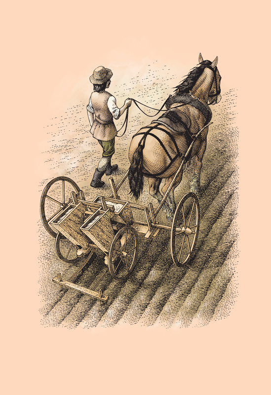 Как известно, при двух и трехполье треть пахотной земли не засеивалась в целях восстановления плодородия почвы. «Норфолкский», или четырехпольный, севооборот позволил значительно увеличить объемы производства, поскольку практически не оставлял сельхозугодий под паром (рис. 10). В первый год сельхозугодья засевали пшеницей, на второй год на этих полях выращивали брюкву и турнепс, на третий ячмень вместе с почвопокровным клевером и плевелом. Поля с клевером и плевелом использовались как пастбище или выкашивались на корм на четвертый год. Корнеплодами кормили крупный рогатый скот и овец зимой.