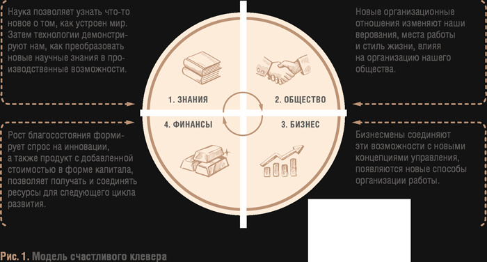 Четвертый лепесток модели счастливого клевера богатство, или деньги поднимает интересный вопрос о критерии успеха для оценки успешности инновации. В современной экономической теории этот критерий экономическая выгода функция максимизации средств акционеров, а для уровня макроэкономики достижение некоего удовлетворительного уровня развития экономики (устойчивый ежегодный рост, приемлемый уровень безработицы и т. п.). В природе критерий один, но более жесткий жизнеспособность. У организмов разные стратегии выживания, но главный результат продолжение жизни в конкретной окружающей среде. Хочешь выжить меняйся. В модели счастливого клевера деньги работают в качестве своего рода «усилителя». Они позволяют получать и соединять ресурсы для получения новых знаний и вывода успешно коммерциализированных изобретений на следующий цикл развития.