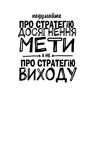 Ще одне запитання, яке часто можна почути: «Яка ваша стратегія виходу?» Його ставлять навіть тим, хто лише починає свою справу. Тобто люди не можуть навіть розпочати щось створювати, не продумавши, як вони потім покидатимуть цю справу. Люди, що з вами? Навіщо випереджати події? Ваші пріоритети нежиттєздатні, якщо ви ще й не стрибнули у воду, а вже думаєте про те, як вибратися на берег.