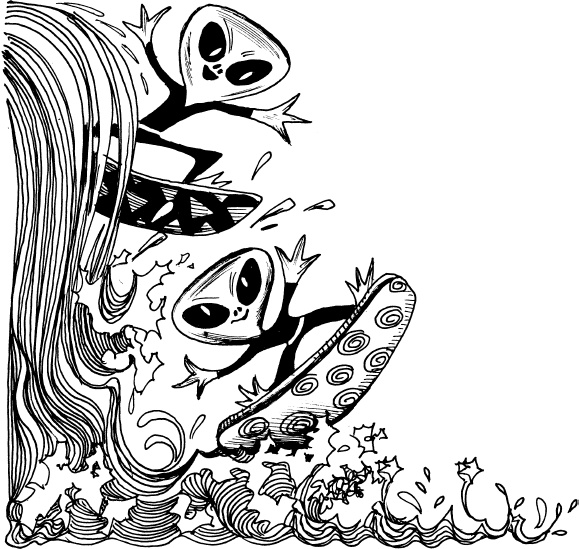 И вдруг Аля увидела водопад сногсшибательное зрелище! Наверное, этот водопад был не меньше Ниагарского. Вода не падала с обрыва вертикально вниз, а с грохотом скатывалась по крутому склону горы, ударяясь о камни и рассыпаясь на миллионы разноцветных, сверкающих брызг. У бяки захватило дух от такой красоты и величия, но вдруг на перевале, на самом верху, в том месте, откуда лилась вода, появился злыдень. Потом другой, а потом и третий, четвёртый. Злыдни заскользили вниз по водопаду на разноцветных досках, похожих на ледянки.