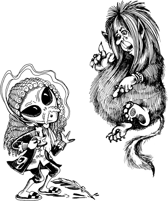 В окно заглянула яркая луна. Булькая и поругиваясь, Мобиус вернулся за письменный стол, взял в руки перо и вдруг позеленел от неожиданности: под потолком кабинета висело чёрное и лохматое существо.