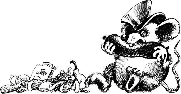 Мышонок хмуро, исподлобья взглянул на бяку и промолчал. Он сосредоточенно жевал сардельку, мясной сок стекал по его усам и подбородку, серебристая шляпа съехала набок.