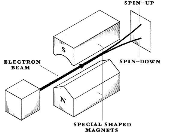 Чтобы разобраться, где верх, а где низ, можно пропустить электроны через устройство, состоящее из пары обычных магнитов, и посмотреть, в какую сторону электрон отклонится. На рисунке внизу показано, что у тех, которые отклоняются вверх, спин направлен вверх, а те, которые отклоняются вниз вниз.