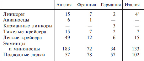 И все же эта война была не более чем незначительным инцидентом для немецкого флота, если иметь в виду серьезность ситуации, в которой он оказался в результате стратегии Гитлера. Он был теперь вовлечен в большую войну, причем в одиночку, без Италии. Катастрофическое неравенство флотов воюющих стран показано в следующей ниже таблице: