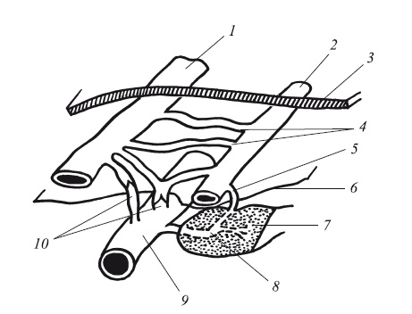 1 большая подкожная вена; 2 малая подкожная вена; 3 кожа; 4 коммуниканты между малой и большой подкожными венами; 5 непрямой перфорант; 6 фасция бедра или голени; 7 мышца; 8 перфорант в мышцу; 9 магистральная вена системы глубоких вен (бедренная); 10- перфоранты, соединяющие систему глубоких и поверхностных вен