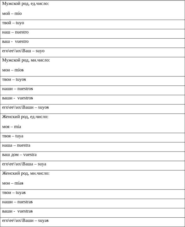 Притяжательные местоимения краткой формы согласуются с определяемыми существительными в числе, а c местоимениями «наш (nuestro), ваш (vuestro) в роде и числе.