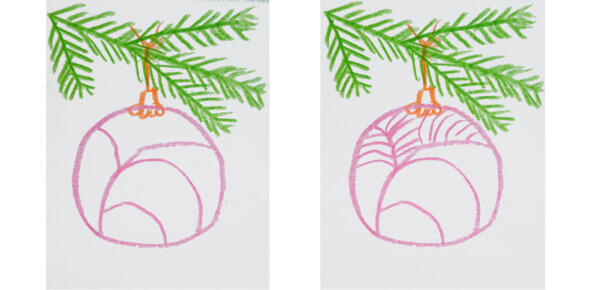 Сначала мелком нарисуем кружок посередине листа. Над кружком нарисуем светлым зеленым мелком ветку. На ветке нарисуем иголки и добавим к шару наверху крепление и нитку, которой он привязан к ветке.