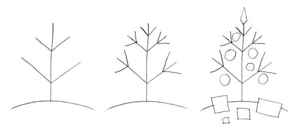 На сугробе нарисуем «скелет» елочки. Мы не будем рисовать ветки полностью, только наметим их серединки. Сначала нарисуем линию ствола, а потом приделаем к ней две пары веток. Нижние ветки будут длиннее. На конце ствола и веток нарисуем еще по паре небольших веточек.
